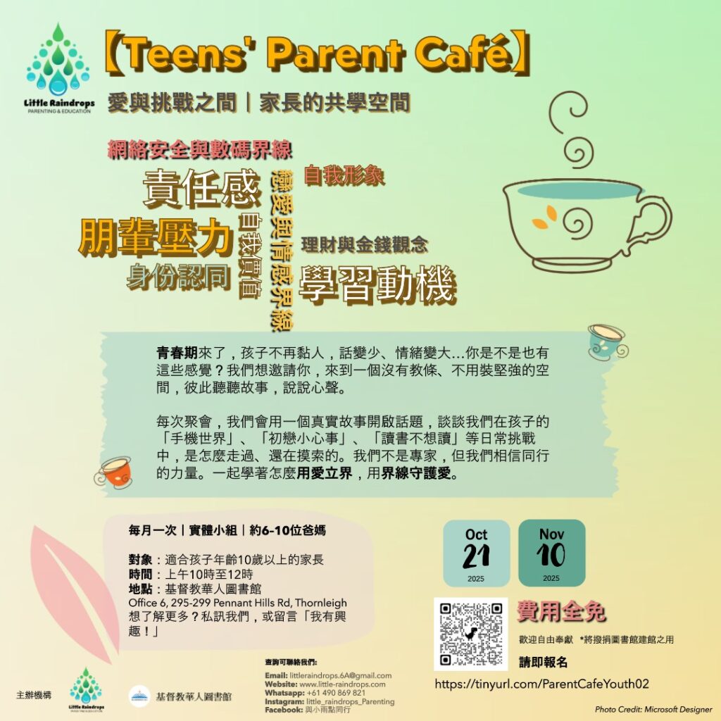 | 日期:2025年10月21日(二) 或 2025年11月10日(一) 時間: 雪梨時間: 10:00 AM – 12:00 noon 地點:基督教華人圖書館 Office 6, 295-299 Pennant Hills Rd, Thornleigh 對象:適合孩子年齡 10歲以上的家長 |