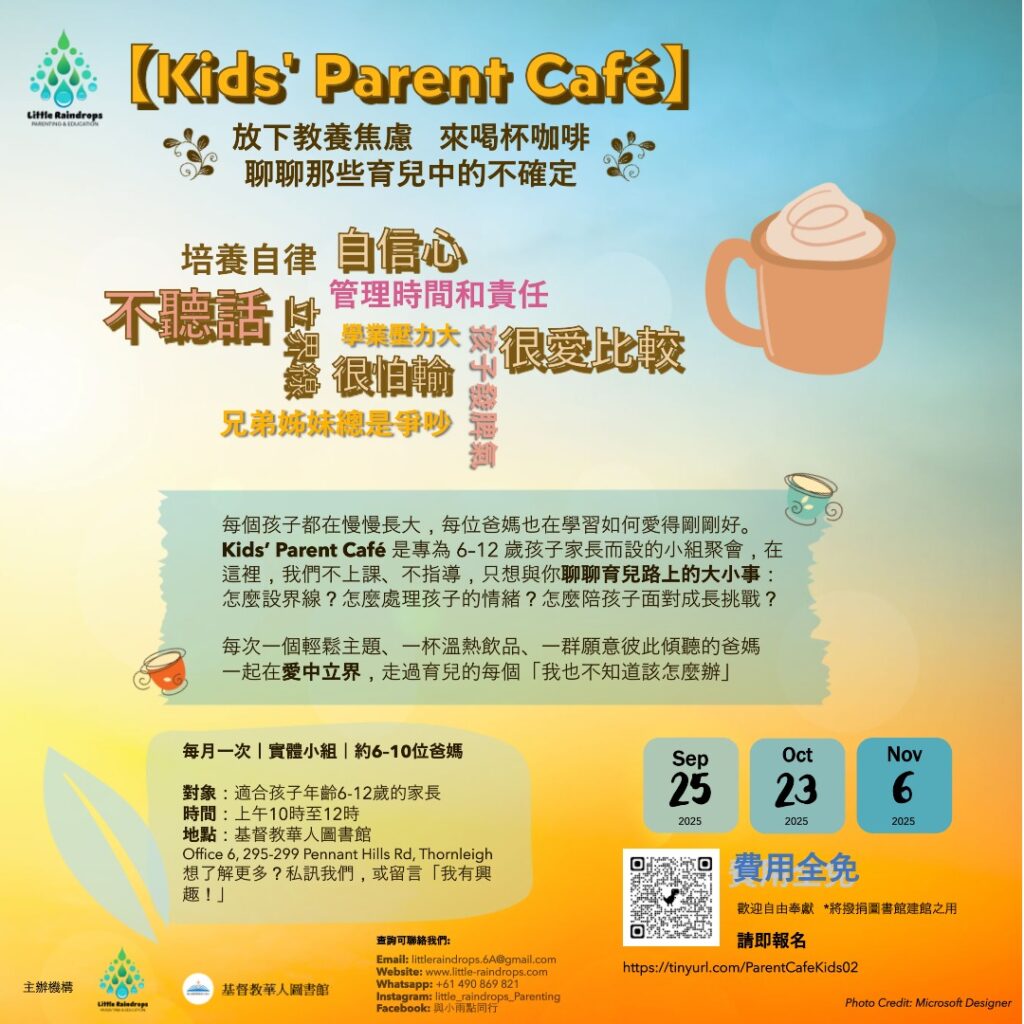 | 日期:2025年9月25日(四) 或 2025年10月23日(四) 或 2025年11月6日(四) 時間:雪梨時間: 10:00 AM – 12:00 noon 地點:基督教華人圖書館 Office 6, 295-299 Pennant Hills Rd, Thornleigh 對象:適合孩子年齡6-12歲的家長 |