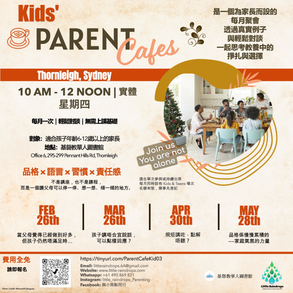 | 📍 每月一次|實體相聚(6–10位家長) 💬 適合12歲以下孩子的爸媽 📍2026年2月26日(四), 2026年3月26日(四), 2026年4月30日(四), 2026年5月28日(四) 💬時間: 雪梨時間: 10:00am-12noon 📍地點:基督教華人圖書館 Office 6, 295-299 Pennant Hills Rd, Thornleigh ✨報名連結: https://tinyurl.com/ParentCafeKid03 |