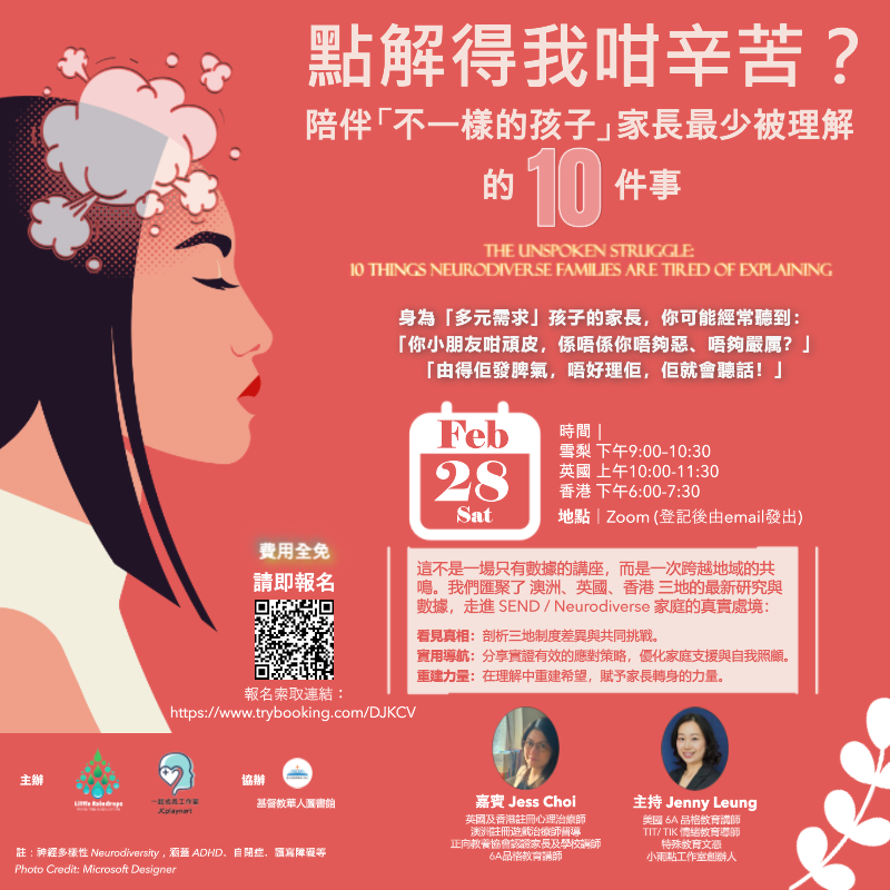 | 📅 日期| 2026年2月28日(六) ⏰ 時間| 雪梨 下午9:00–10:30 英國 上午10:00-11:30 香港 下午6:00-7:30 📍 地點: 線上Zoom (登記後由email發出) 費用全免 報名索取連結: https://www.trybooking.com/DJKCV Little Raindrops Parenting & Education 及 一起成長工作室 主辦 基督教華人圖書館 協辦 |